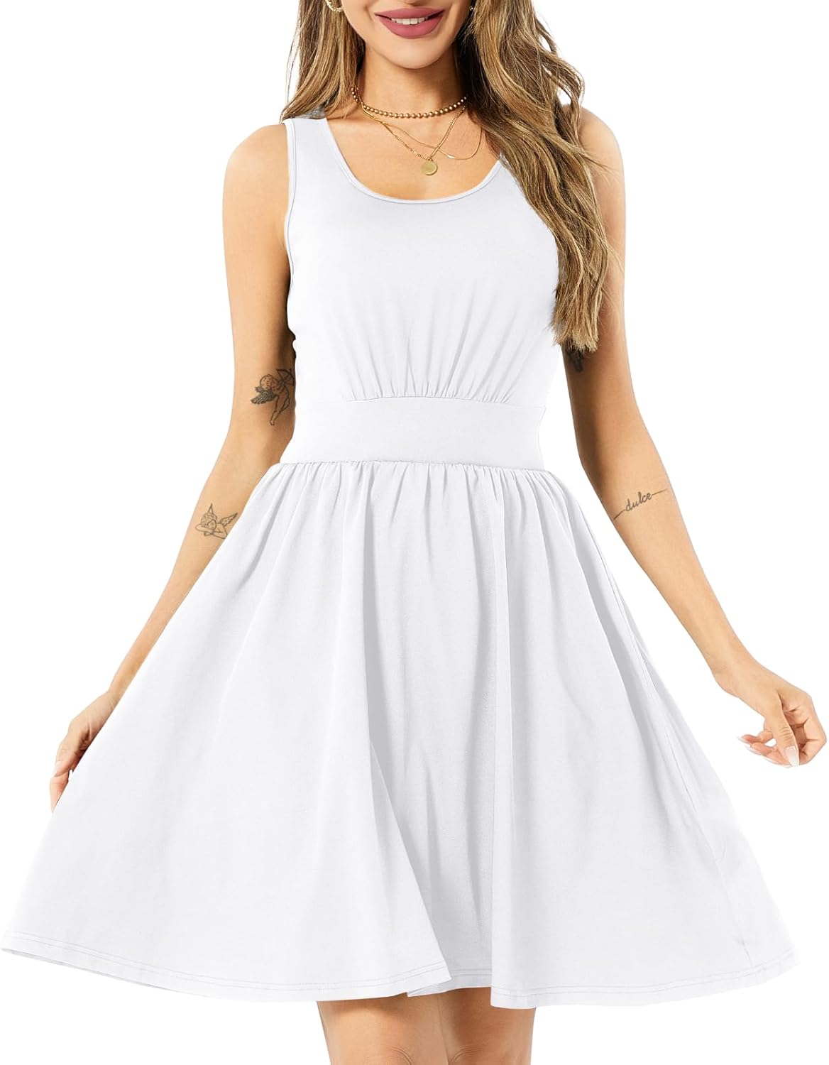 Women's Summer Dresses Casual U Neck Sundresses Pleated Knee Length Sleeveless Beach Flowy Tank Midi Dress