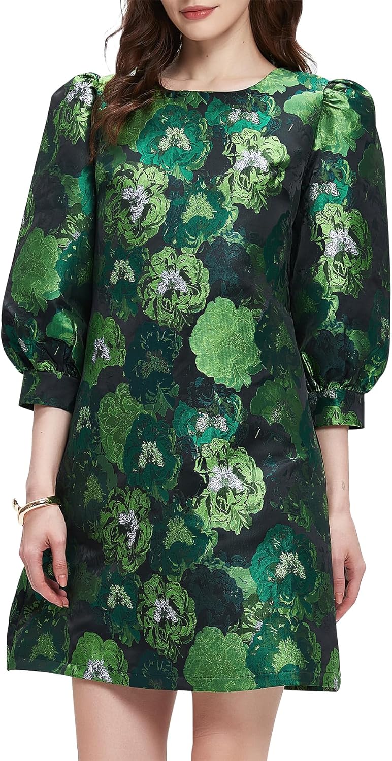 Kedera Women's Jacquard Dress Long Puff Sleeves Shift Mini Elegant Floral Dress Summer Business
