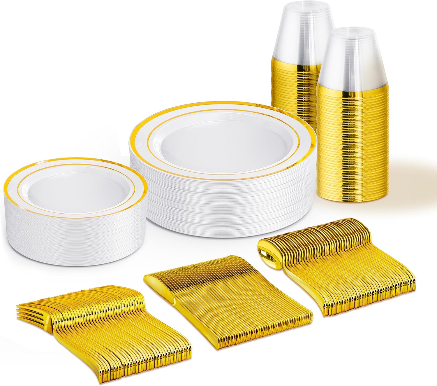 - Disposable and Hassle-Free: With these 25 guests plastic dinnerware set of gold plastic plates, cups, knives, forks, and spoons, you can host a party without the worry of cleanup. Simply dispose of the used items after the event, eliminating the need for time-consuming washing