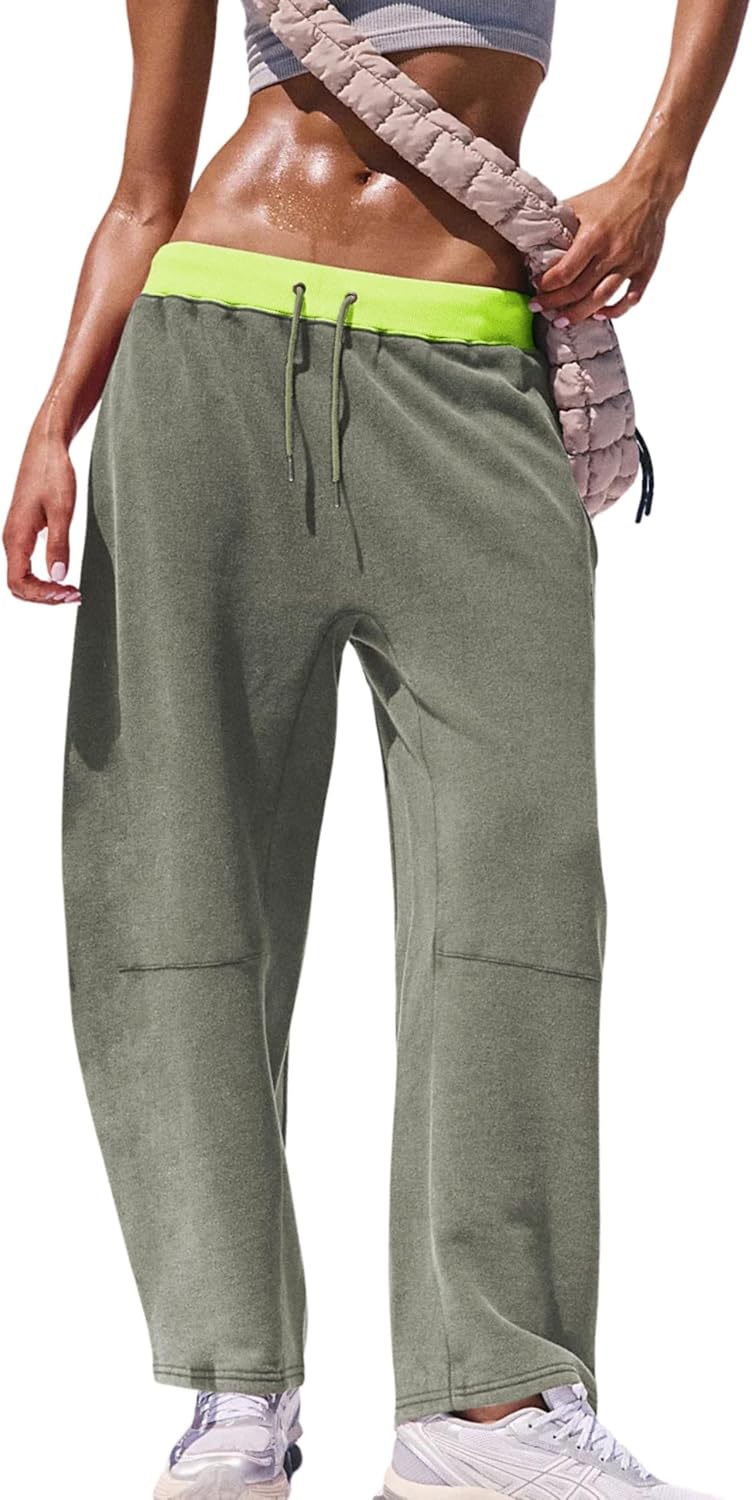 Athlisan Womens Barrel Sweatpants Baggy Wide Leg Color Block Workout Track Pants Trousers(GreyGreen-S)
