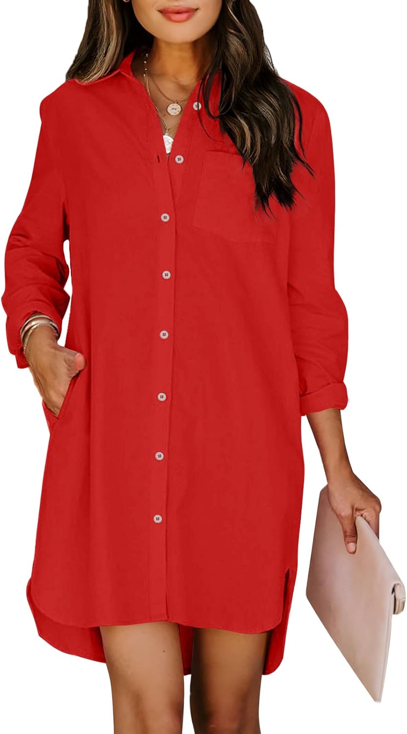 Paintcolors Women's Button Up Tunics Cotton Button Down Shirt Dresses with Pockets Solid Color High Low Blouse Tops