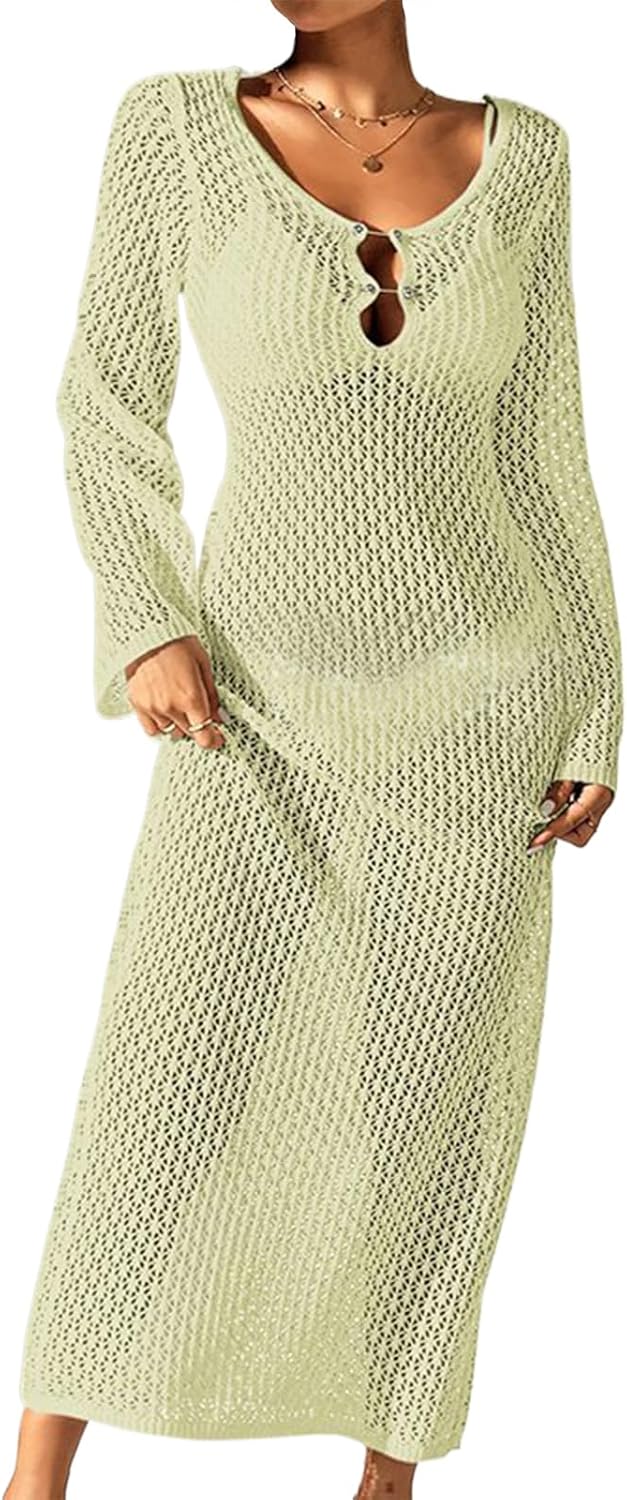 Backless Crochet Beach Coverup Long Sleeve Beach Dress Full Length Crochet Beach Swimwears Coverup Bathing Suit Coverup
