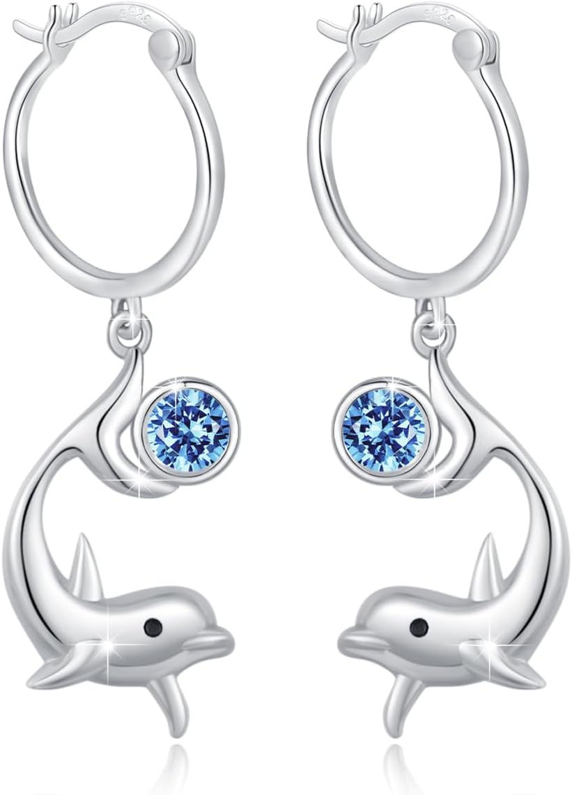 TRISHULA Dolphin Dangle Earrings Dolphin Hoop Earrings 925 Sterling Silver Dolphin with Cubic Zirconia Dangle Drop Earrings Ocean Animal Earrings Dolphin Jewelry for Dolphin Lover Women Ladies