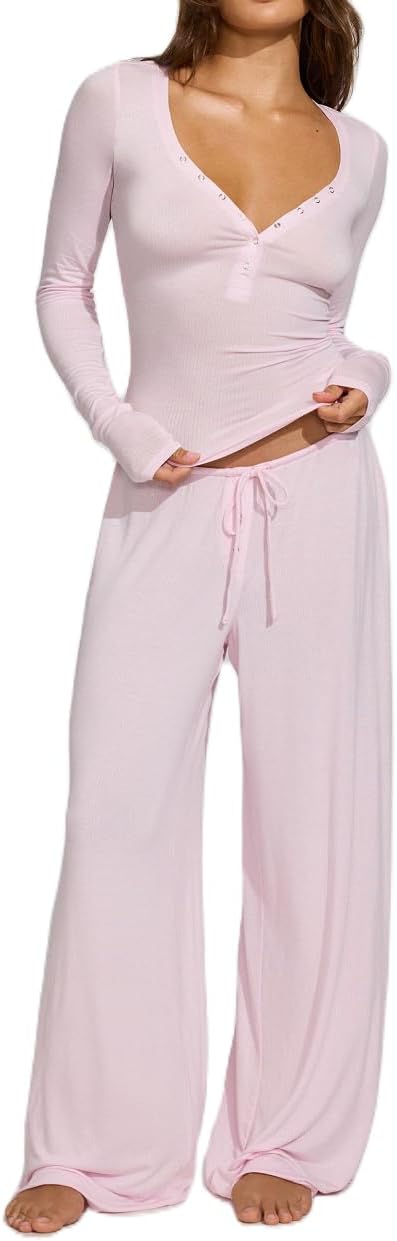 ROAONOCOMO Women Y2K Floral 2 Piece Lounge Set Long Sleeve Fitted Tee Shirt Top Wide Leg Long Pants Cute Pajama Outfit