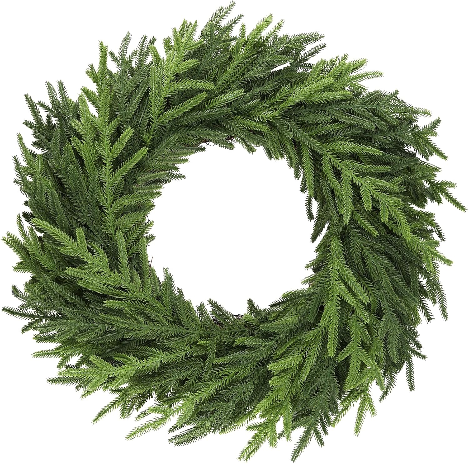 - 【 Realistic PE Material & Handcrafted Design】Crafted from high-quality polyethylene (PE), which is soft and flexible, and not easy to fade or break, this 22-inch norfolk pine wreath delivers an authentic real-touch feel and lifelike appearance. Featuring delicately arranged pine branches on a sturdy grapevine base, it replicates the natural beauty of fresh winter greenery while offering exceptional durability
