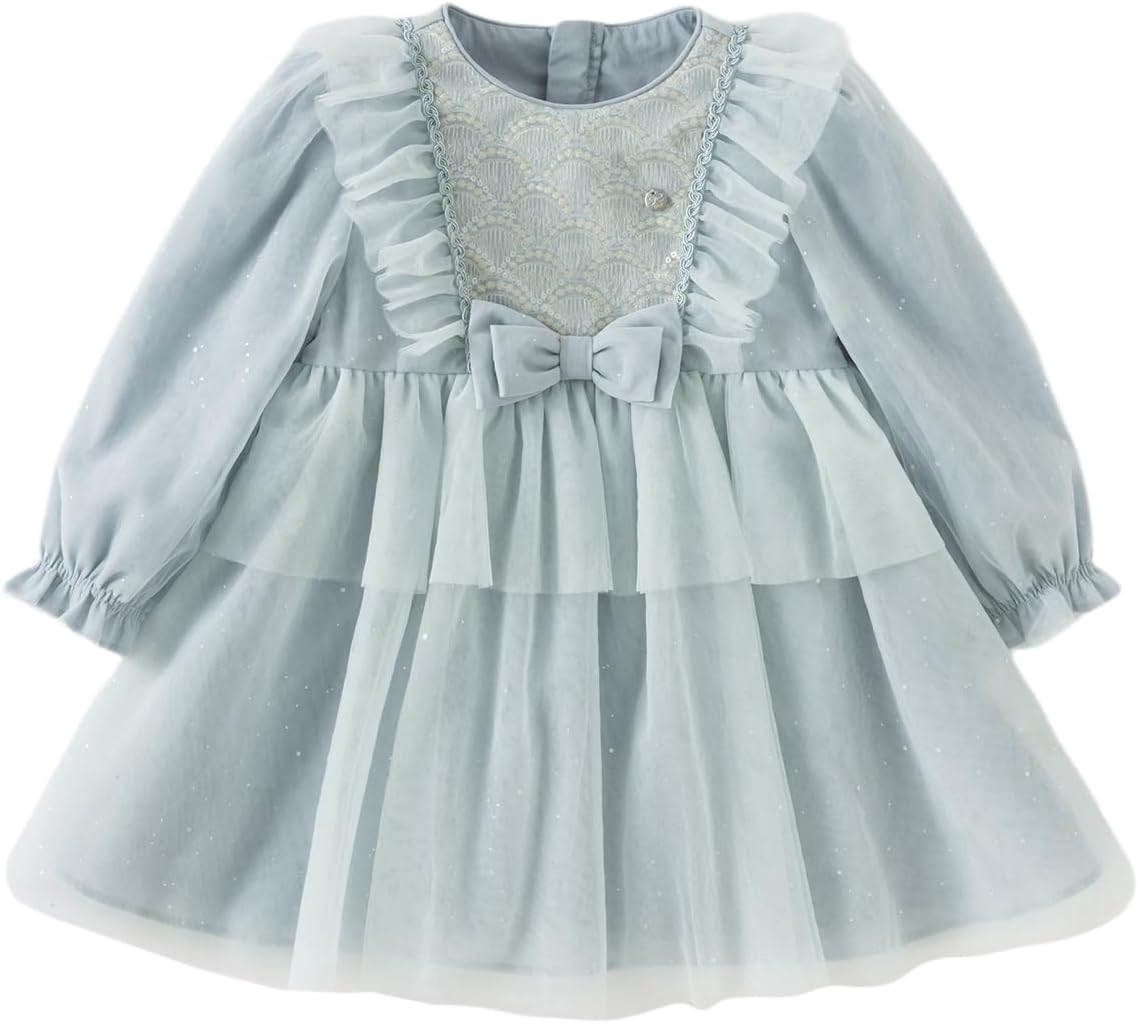 DAVE&BELLA Baby Girls Tulle Dress Long Sleeve Ruffed A-Line Princess Dress Flower Girl Embroidery Bowknot Wedding Party Dress