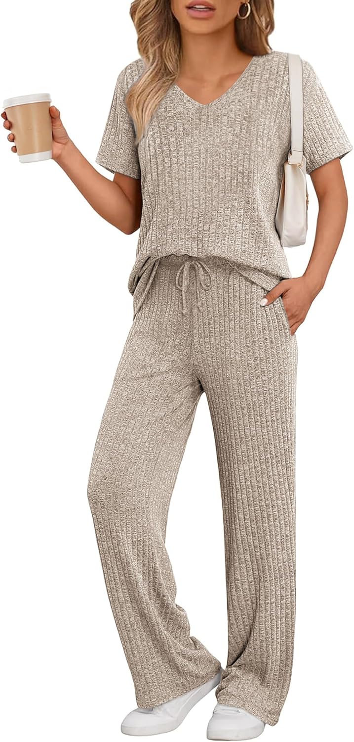 JiniGolla Women's Ribbed Knit Pajama Set 2 Piece Matching Pj Set Short Sleeve Top and Pants Lounge Set with Pockets