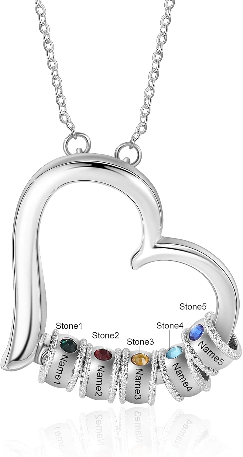 Personalized Women's Pendant Necklace 925 Sterling Silver with 1-5 Simulated Birthstone Names Customized Heart Shape Cubic Zirconia Necklace