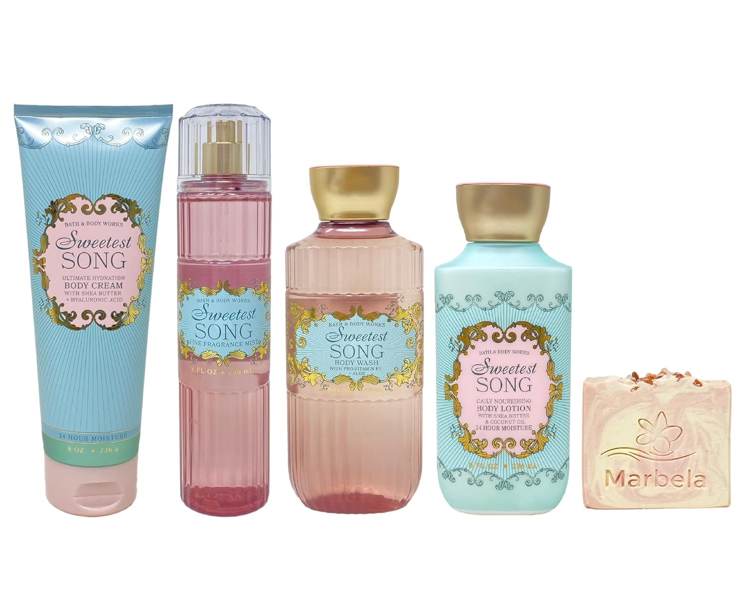 - Bath & Body Works Sweetest Song Deluxe Set with a 4 oz Marbela Himalayan Salts Springs Bar Soap (Soap May Vary).