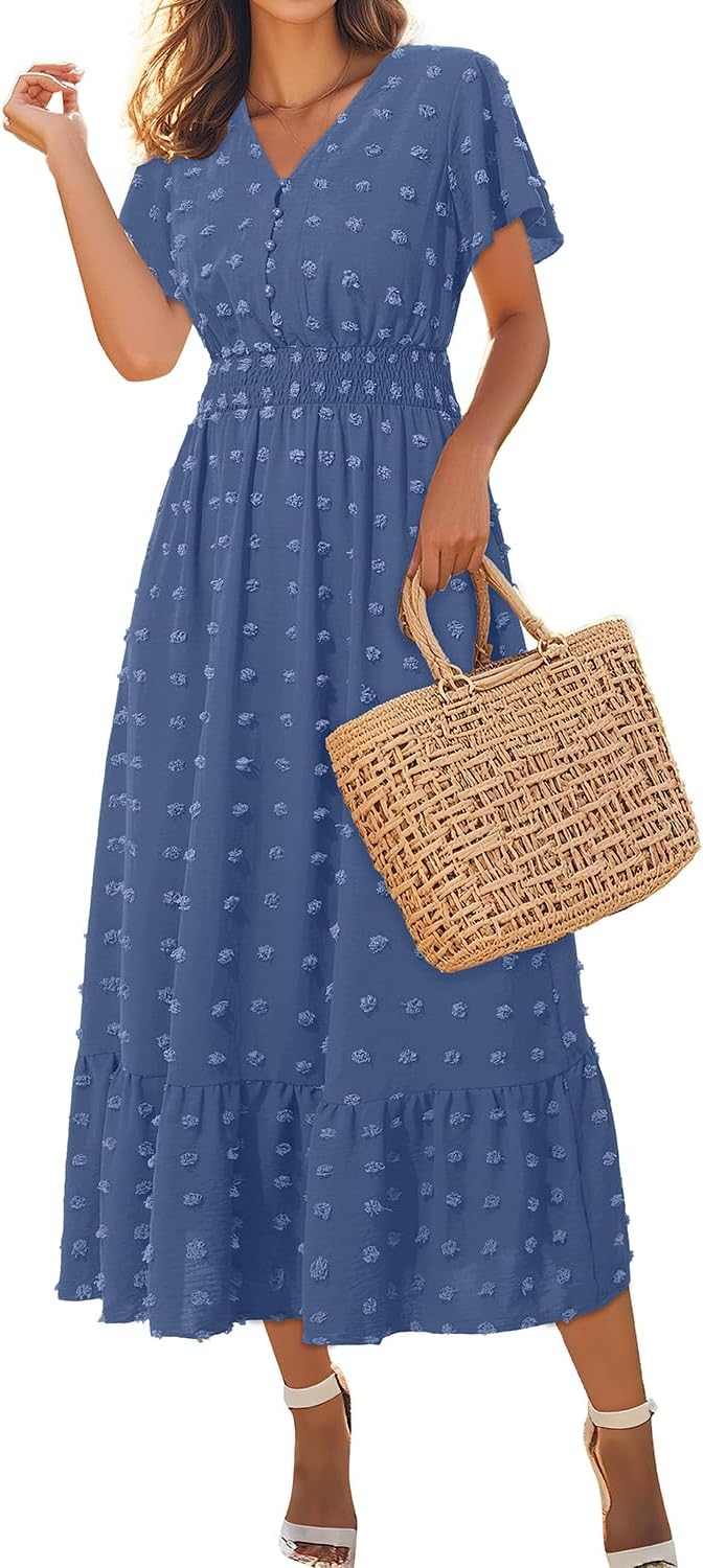 Women Maxi Dresses Boho V Neck Swiss Dot Ruffle Summer Short Sleeve High Waist Tiered Flowy Smocked Cocktail Dresses