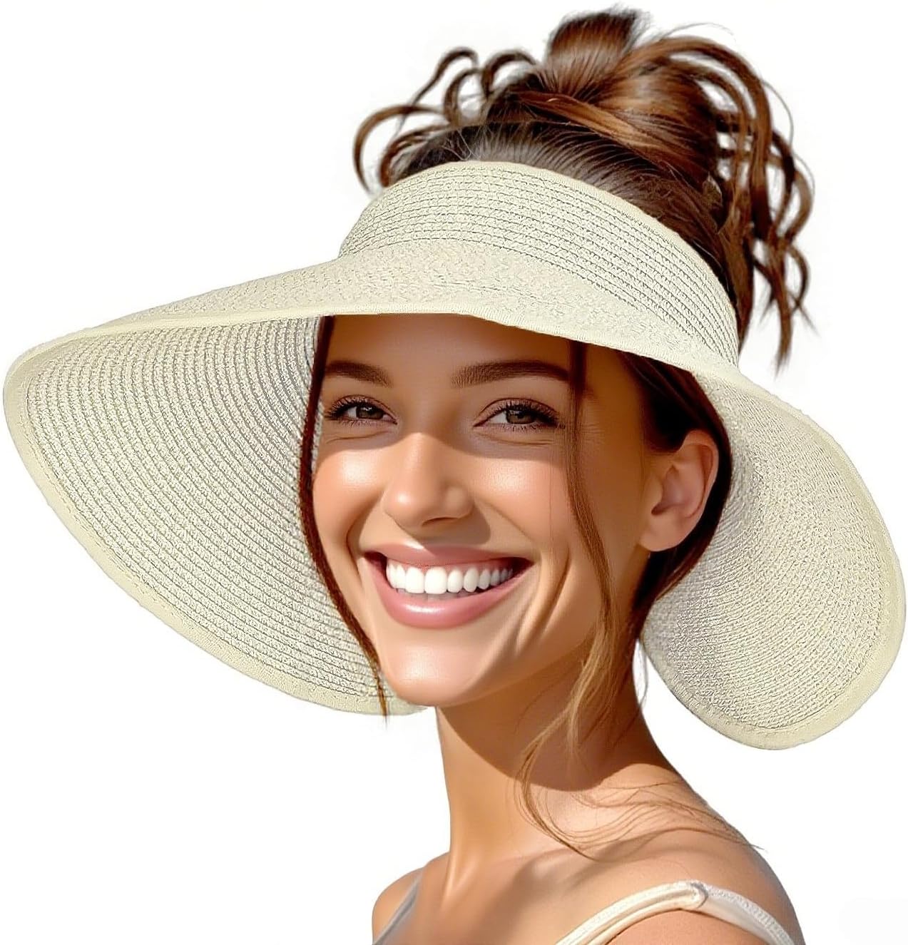 Sun Visor Straw Hats for Women, Foldable Summer Floppy Wide Brim Ponytail Beach UV Hat Vacation Essentials