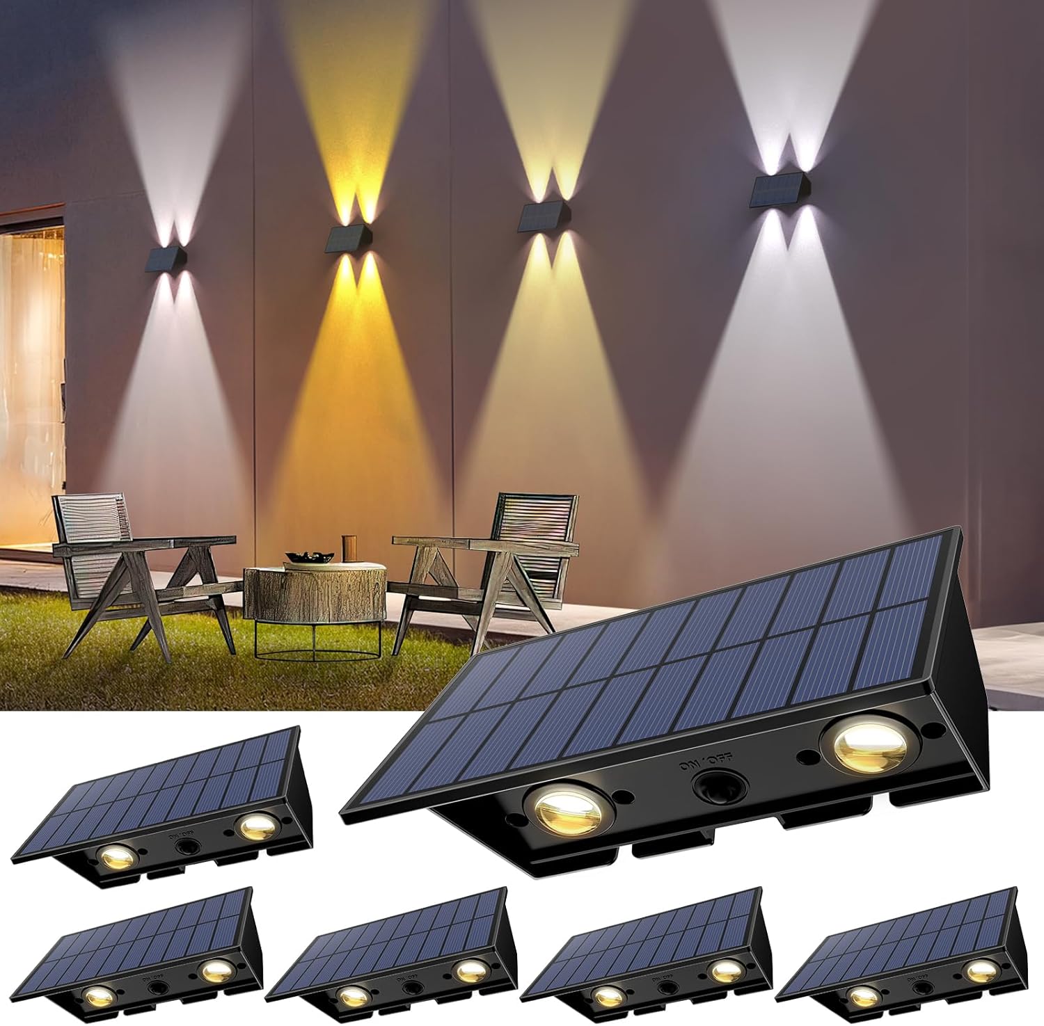 Solar Fence Lights,6Pack Solar Lights Outdoor 2700/4500/6000K 3 Modes Up & Down Wall Lights Waterproof 100 Lumens Dusk to Dawn Fence Light for Outside/Backyard/Pool/Railing/Patio/Porch/Step