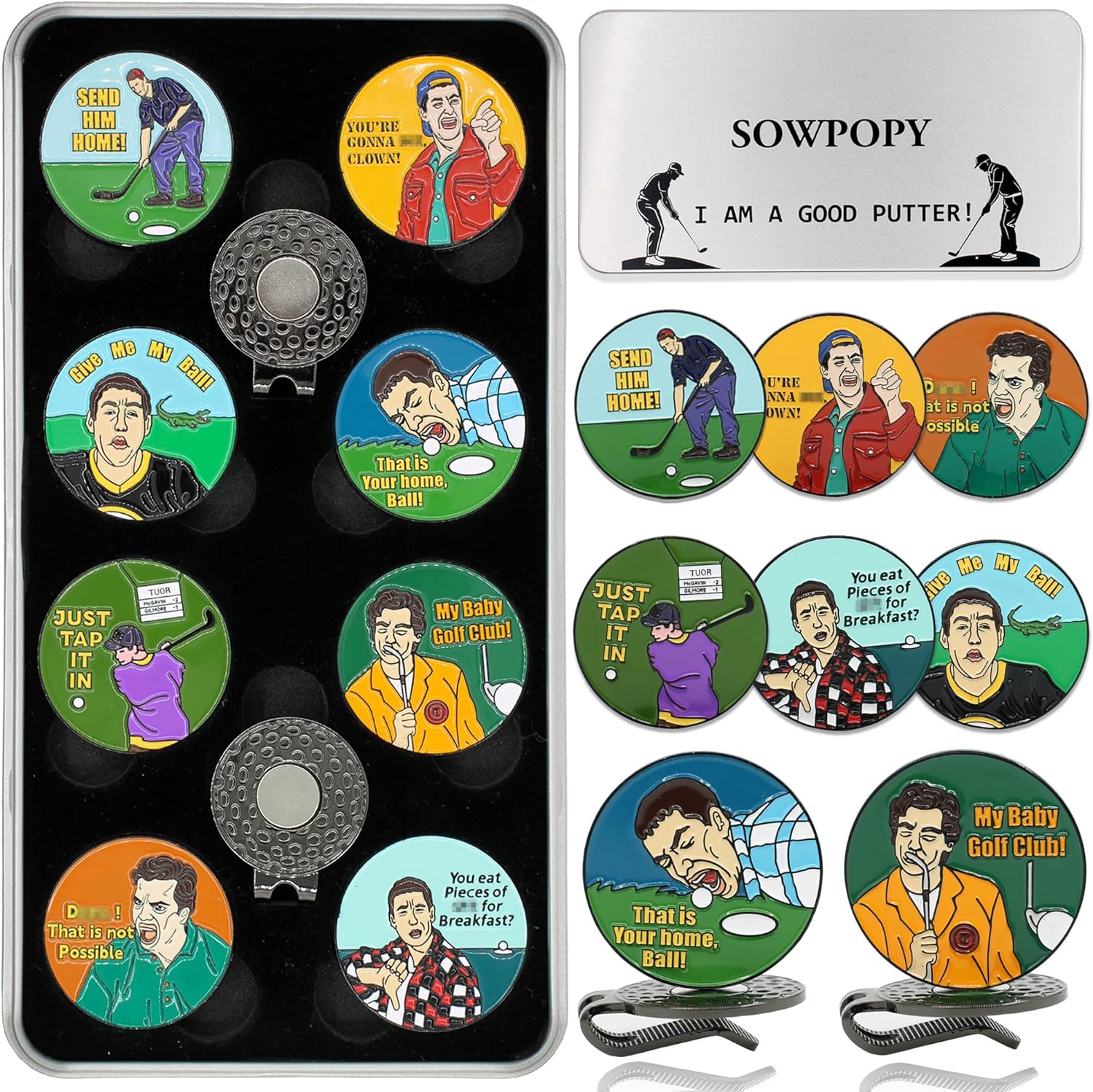 - HILARIOUS DESIGN - These ball markers with magnetic hat clips are tailor-made for golfers with a sense of humor. Catching attention and laughter from your playing partners on the greens, infuse your golf game with much fun and personality through these markers