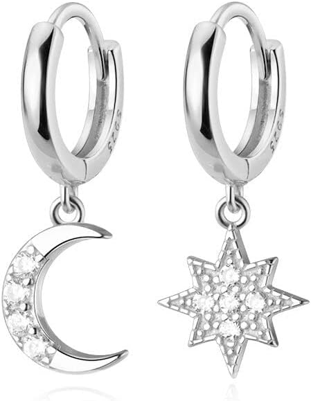 Reffeer Solid 925 Sterling Silver CZ Star Moon Drop Hoop Earrings for Women Teens Crystal Moon Star Hoop Earrings Dangle
