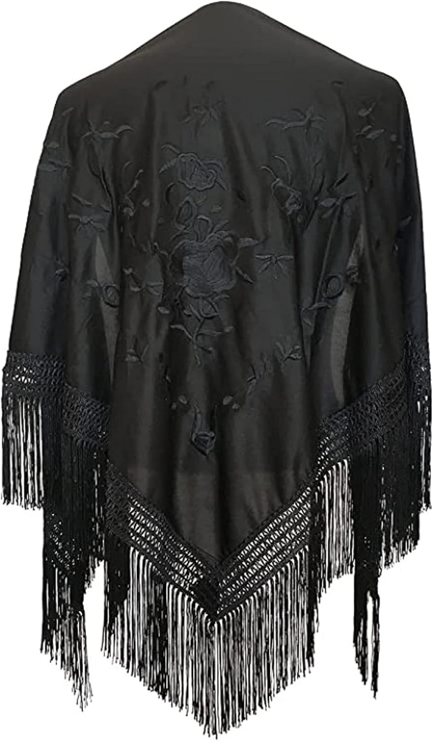 AMINA Black Flamingo Shawl with Fringe - Black Embroidery on One Side - Large Size 190 x 90 cm
