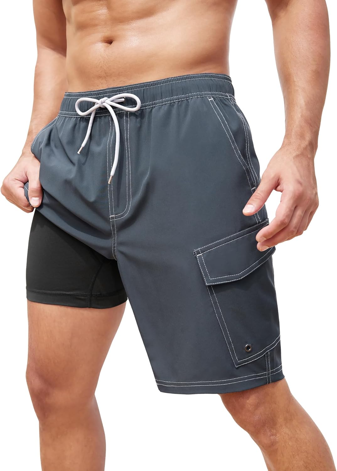 SILKWORLD Mens Swim Trunks with Compression Liner 9 Inch Bathing Suits Quick-Dry Swimming Beach Shorts with Cargo Pockets