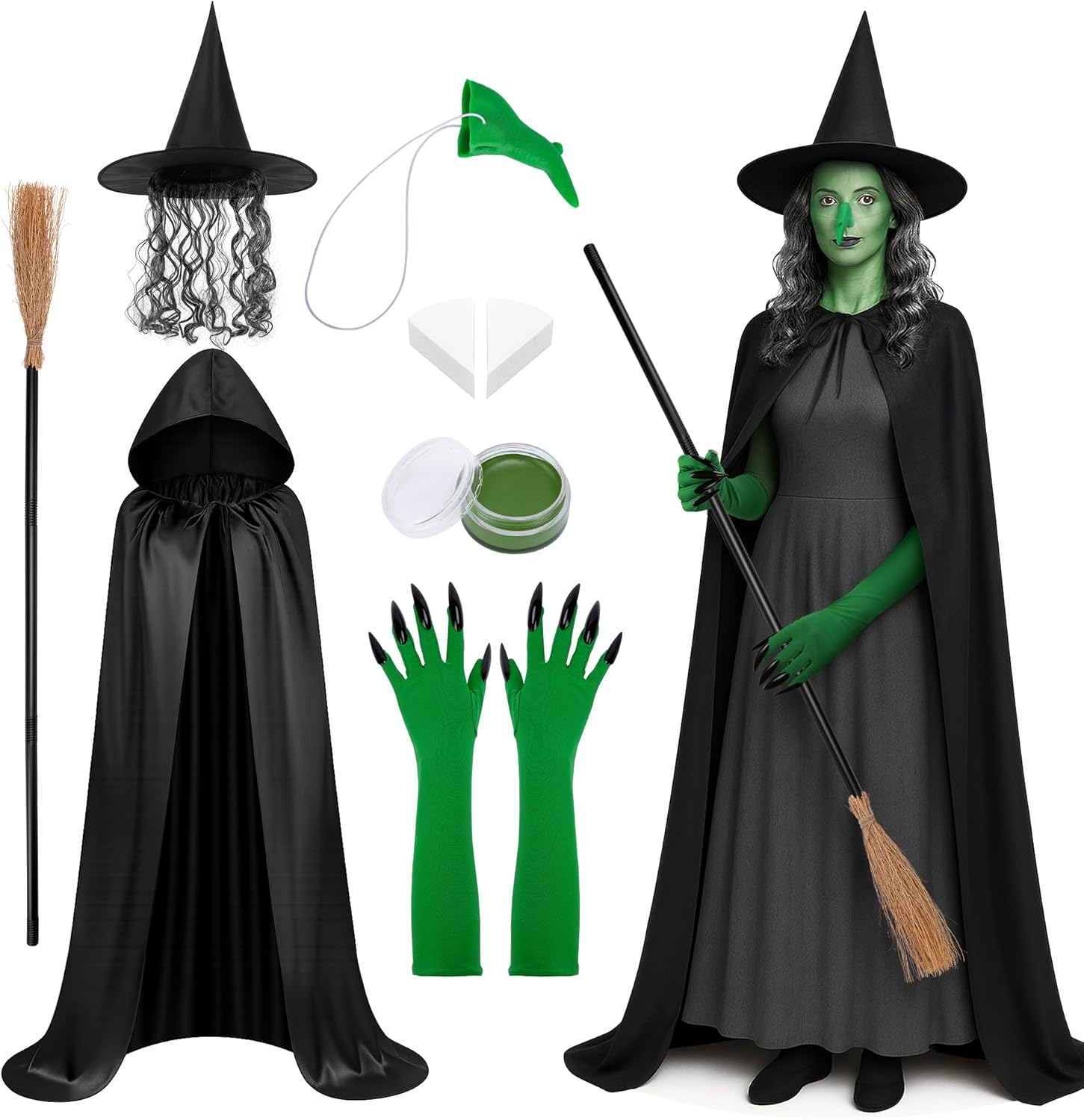 7 Pcs Halloween Green Nose Witch Costumes Set,Old Witch Costume with Broom,Halloween Witches Costume for Women Cosplay Props Party Outfits