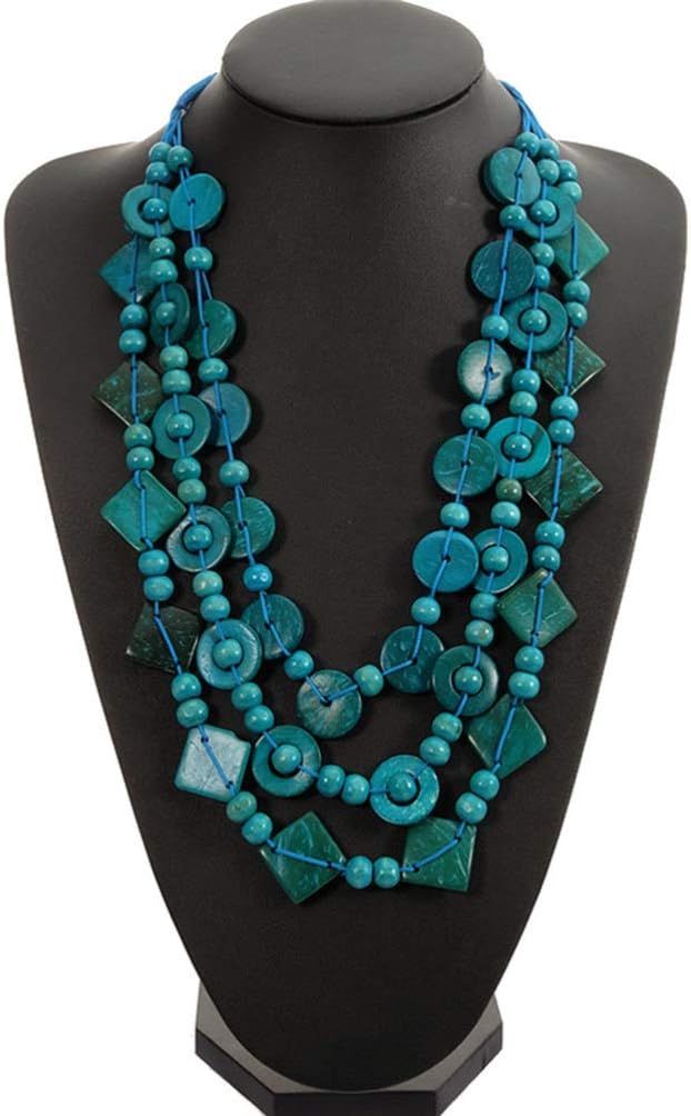 Chunky Necklace Bohemian Shell Necklace Wood Bead Statement Collar Chunky Layered Handmade Beaded Long for Women (Blue, Random)