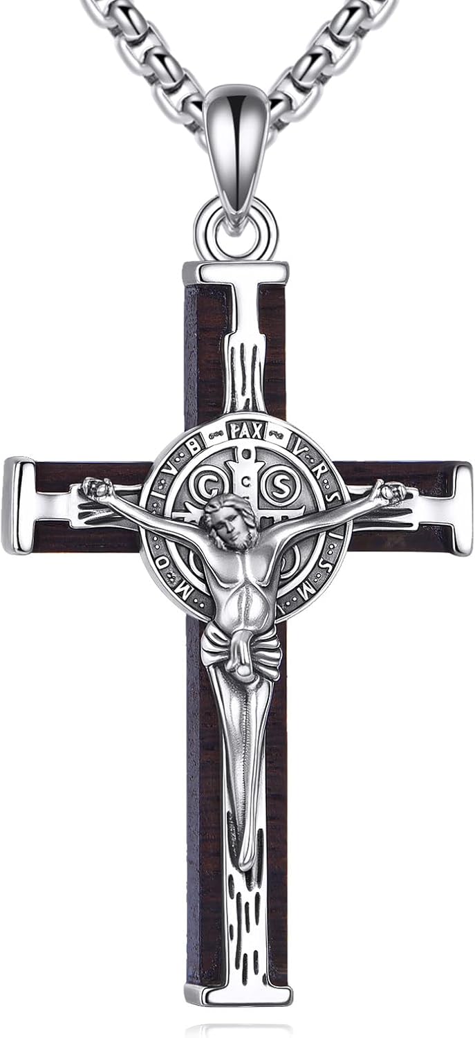 St Benedict Necklace Men Sterling Silver St Benedict Crucifix Medal Wood Cross Necklace San Benito Jewelry Gifts for Men