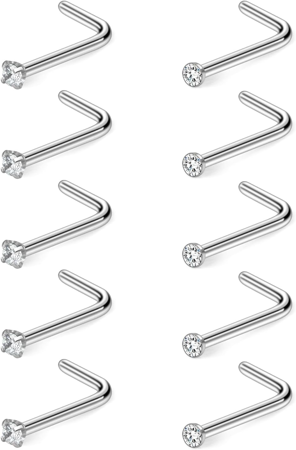 Hoeudjo Nose Studs Surgical Steel Cubic Zirconia Nose Rings Kit for Women Men Tiny Nose Stud Screw & Bone & L Shaped Nostril Piercing Jewelry 24-18 Gauge 10 Pieces