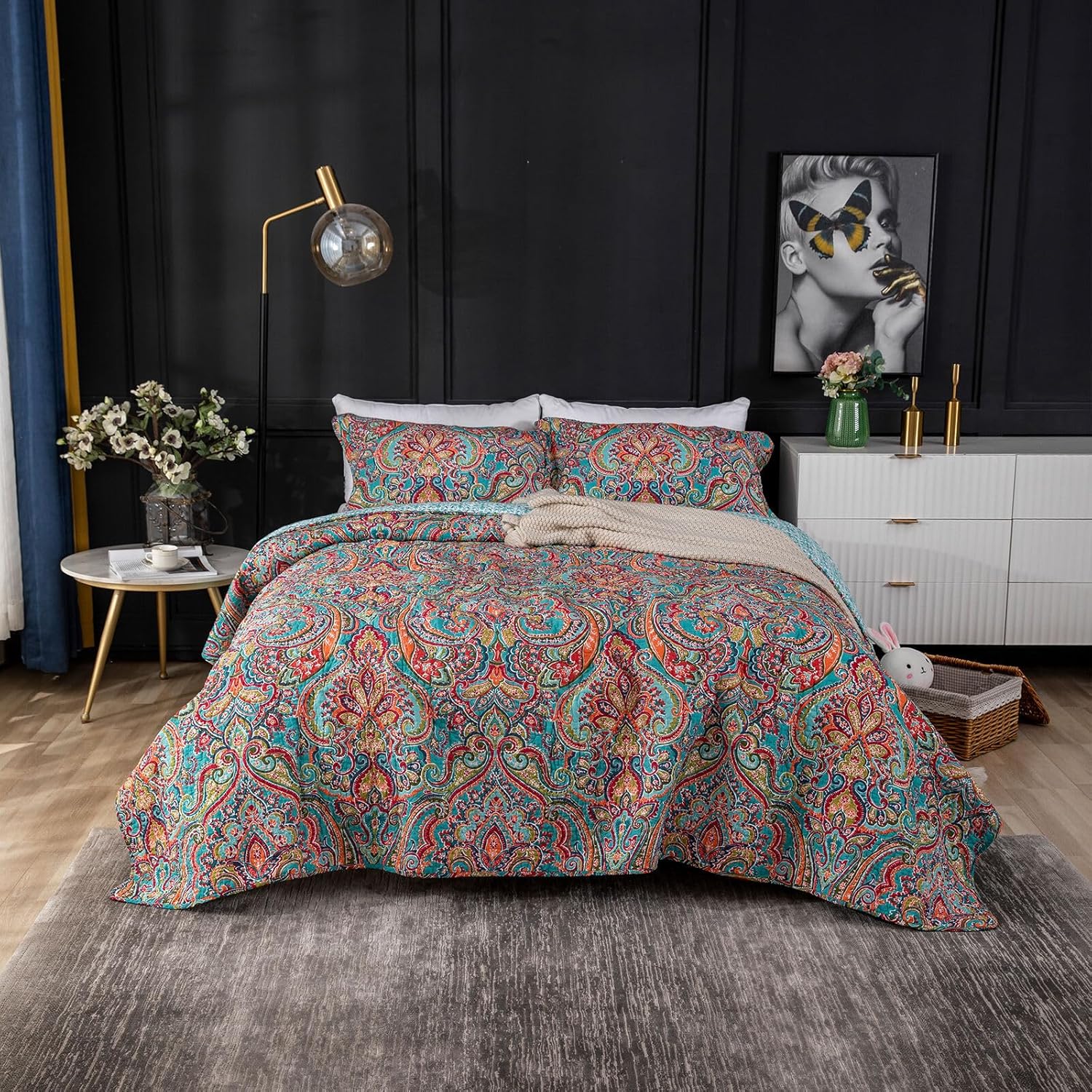 100% Cotton Boho Quilt Set King Size Colorful Gorgeous Paisley Mandala Floral Reversible Quilted Bedding Bohemian Vibrant Exotic Soft Breathable Bedspread Coverlet Set for All Seasons