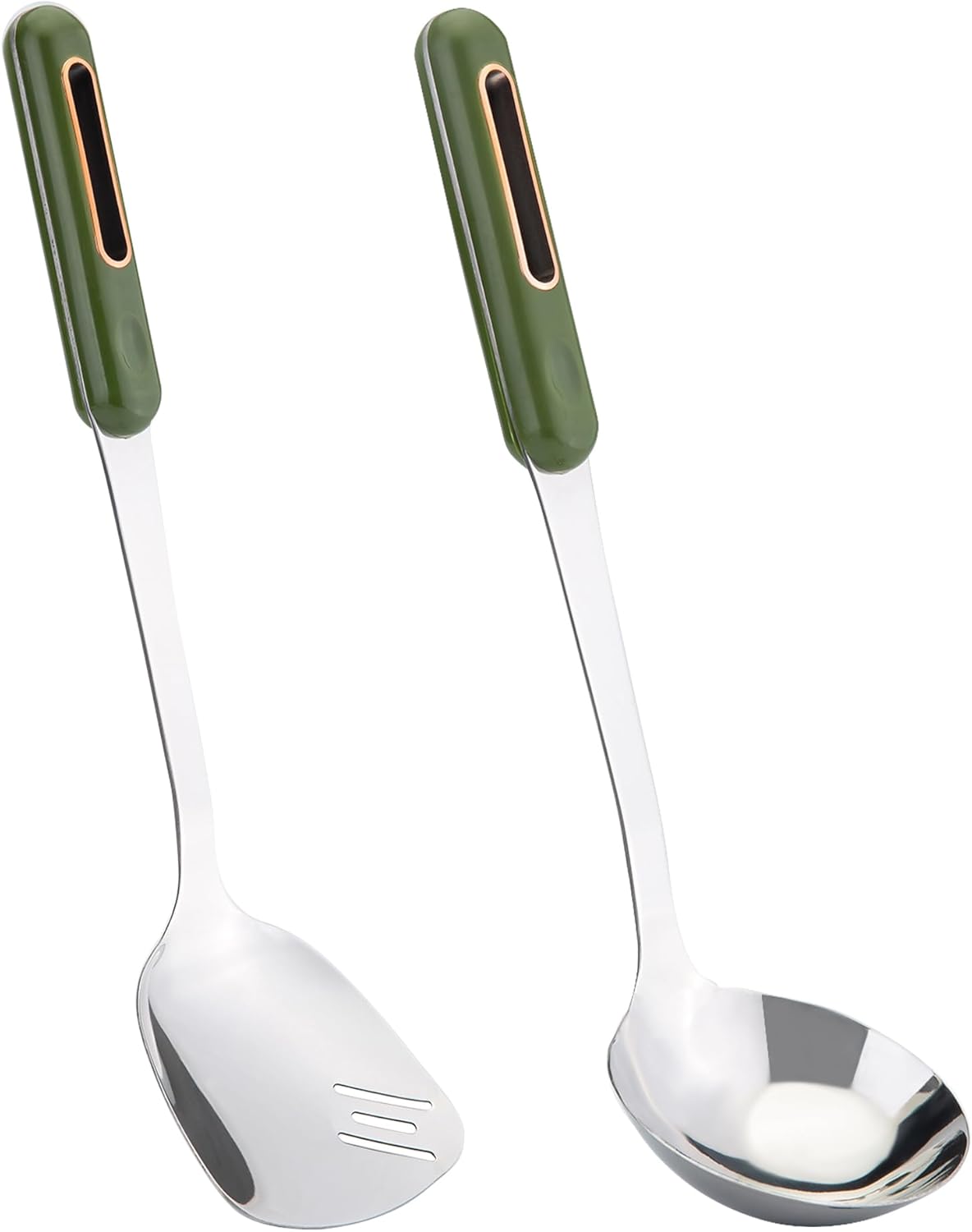 FJNATINH Spatula and Ladle Set - 2 Wok Tools - Universal Ladle and Spatula - Stainless Steel Cooking Utensils and Accessories, 13"-14", Green Handle