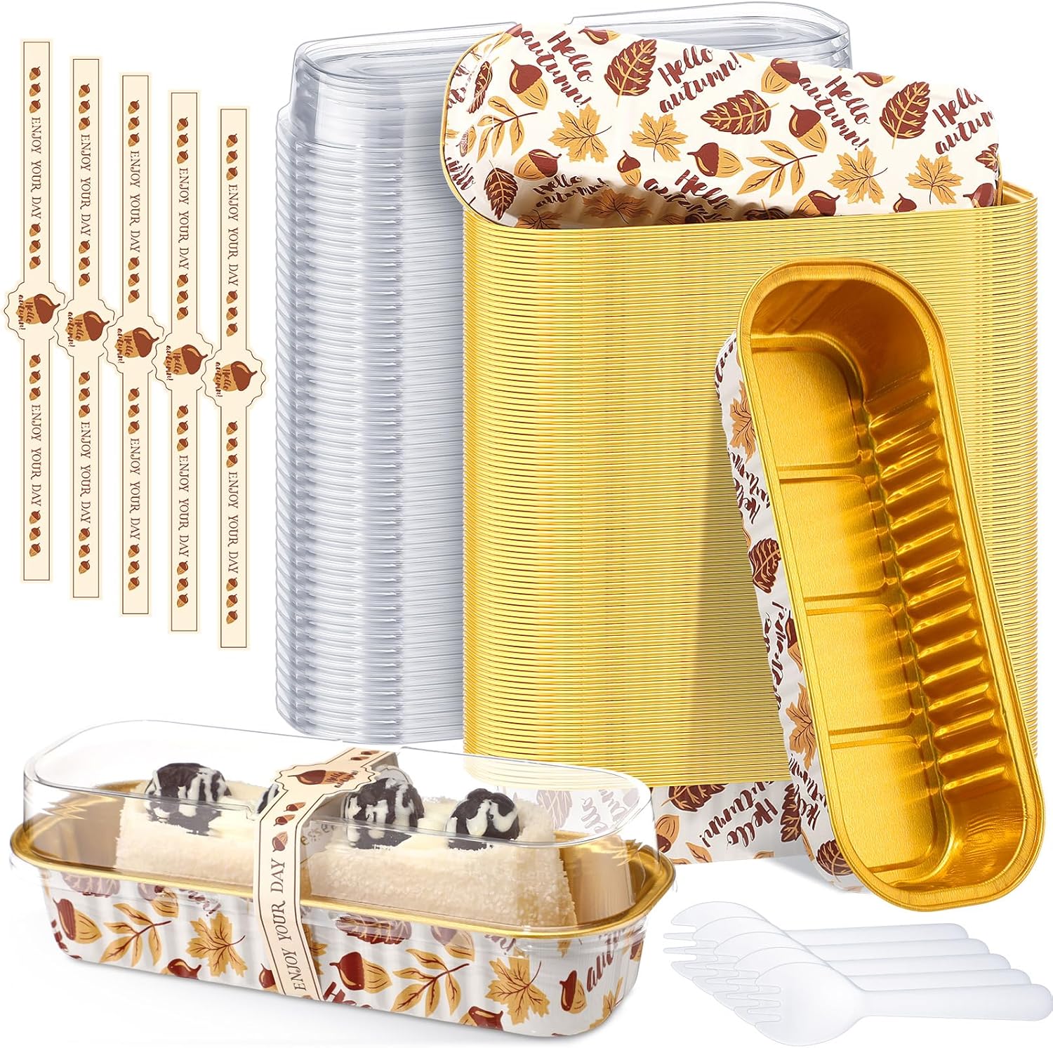 - Mini Cake Pans Set: the mini loaf pans set includes 100 loaf pans, 100 transparent plastic covers, 100 transparent spoons, 100 beautiful stickers for pinning; Abundant quantity for you to make the individual cake for party, celebration, or sales; You can enjoy your day