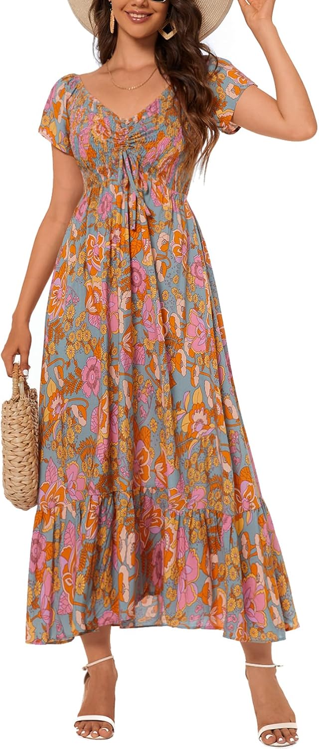 Women's Summer Casual Short Sleeve V Neck Smocked Elastic Waist Tiered Boho Floral Flowy Maxi Dress