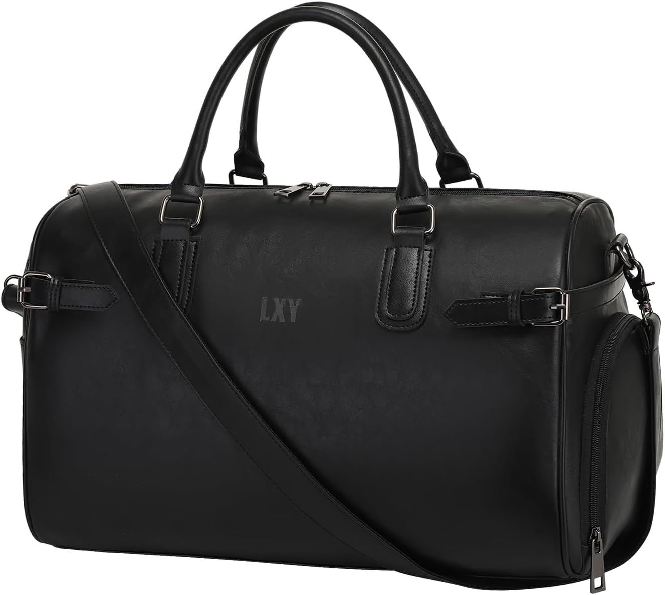 Vegan Leather Duffle Bag, LXY Travel Duffle Weekender Bag with Shoe Compartment, Duffel Overnight Gym Bags for Women Men Black