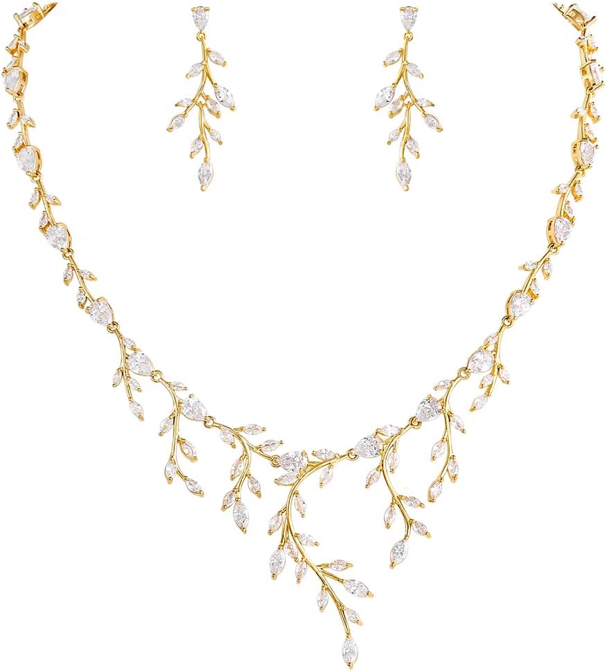 WeimanJewelry Women Marquise Cut Cubic Zirconia Leaf Bridal Y-Necklace and Dangling Earring Jewelry Set for Wedding (Gold style 2)