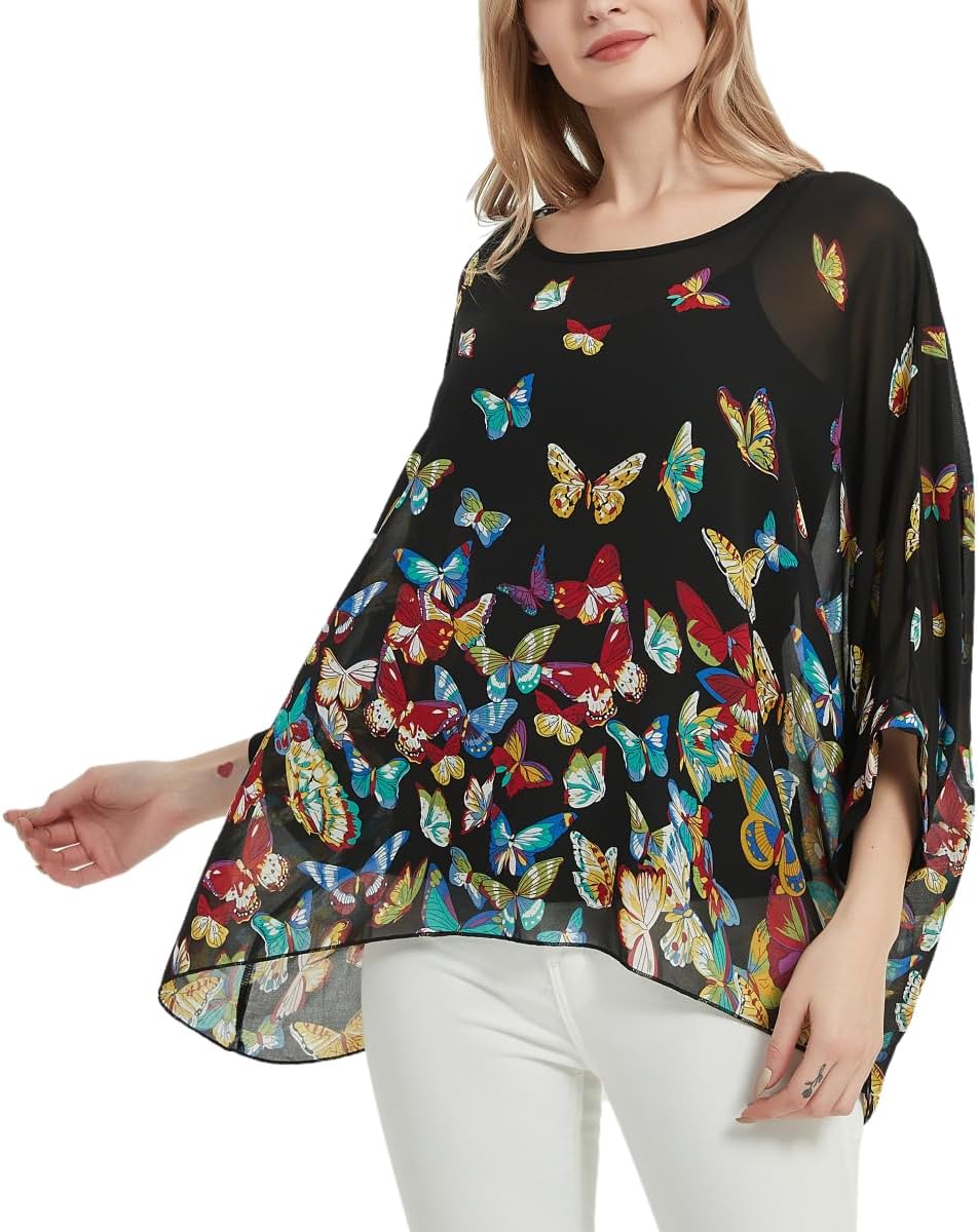 Women's Bohemian Style Batwing Sleeve Butterflies Printed Chiffon Caftan Poncho Tunic Top Beach Loose Shirt