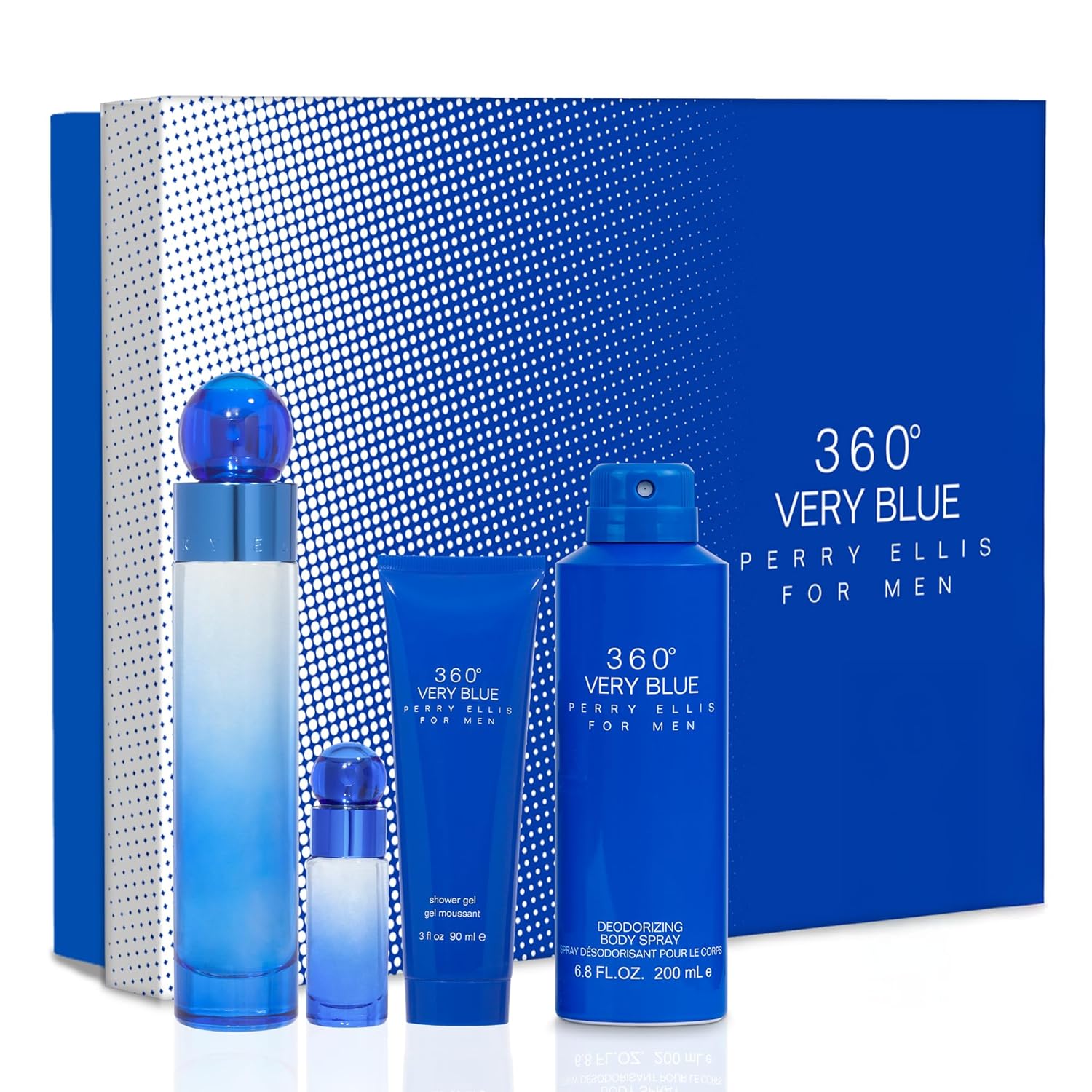 Perry Ellis 360 Very Blue 4 Pieces Gift Set for Men, (3.4 Ounce Eau de Toilette Spray + 6.8 Ounce Body Spray + 3.0 Ounce Shower Gel + 0.25 Ounce Eau de Toilette Spray)