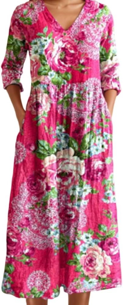 Akivide Women's Long Sleeve Boho Floral Prirted V Neck Tunic Dress Casual Loose Fall Tunic Maxi Dresses 2025 with Pockets