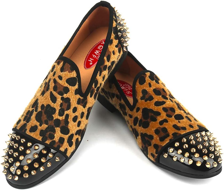 Mens Leopard Loafers Leather Embroidery Spiked Slip on Dress Shoes Slipper Luxury Fashion Penny Prom