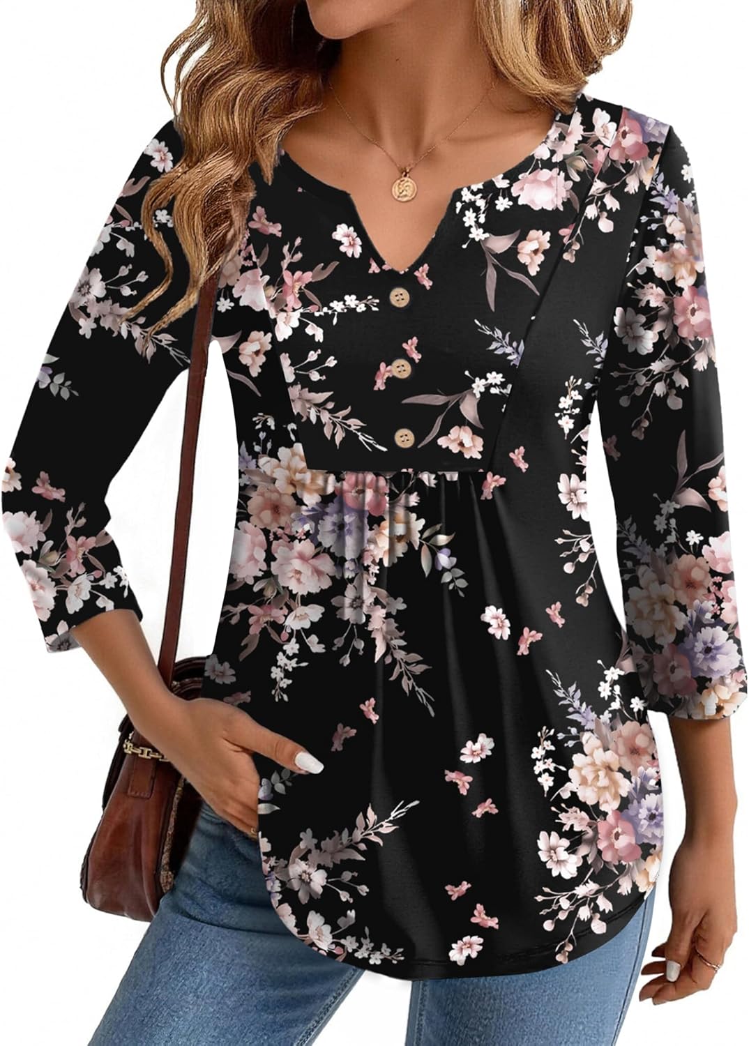 Zeagoo Womens 3/4 Length Sleeve Tops V Neck Dressy Casual T Shirts Pleated Business Work Blouses Basic Tees S-3XL