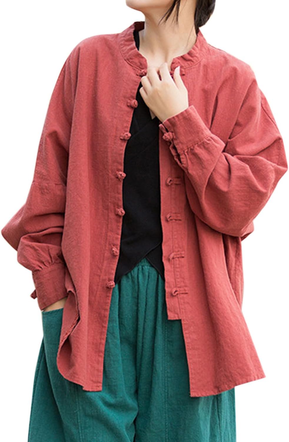 Women's Linen Oversized Blouses Vintage Long Sleeve Jackets Loose fit Chinese Frog Shirts