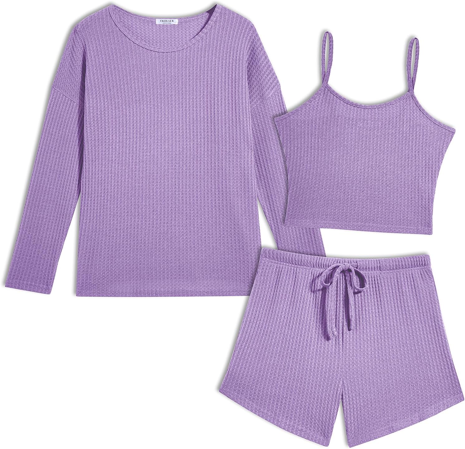 Ekouaer 3 Piece Waffle Knit Lounge Set for Women, Long Sleeve and Cami Top with Shorts Pajama Sets for All Seasons