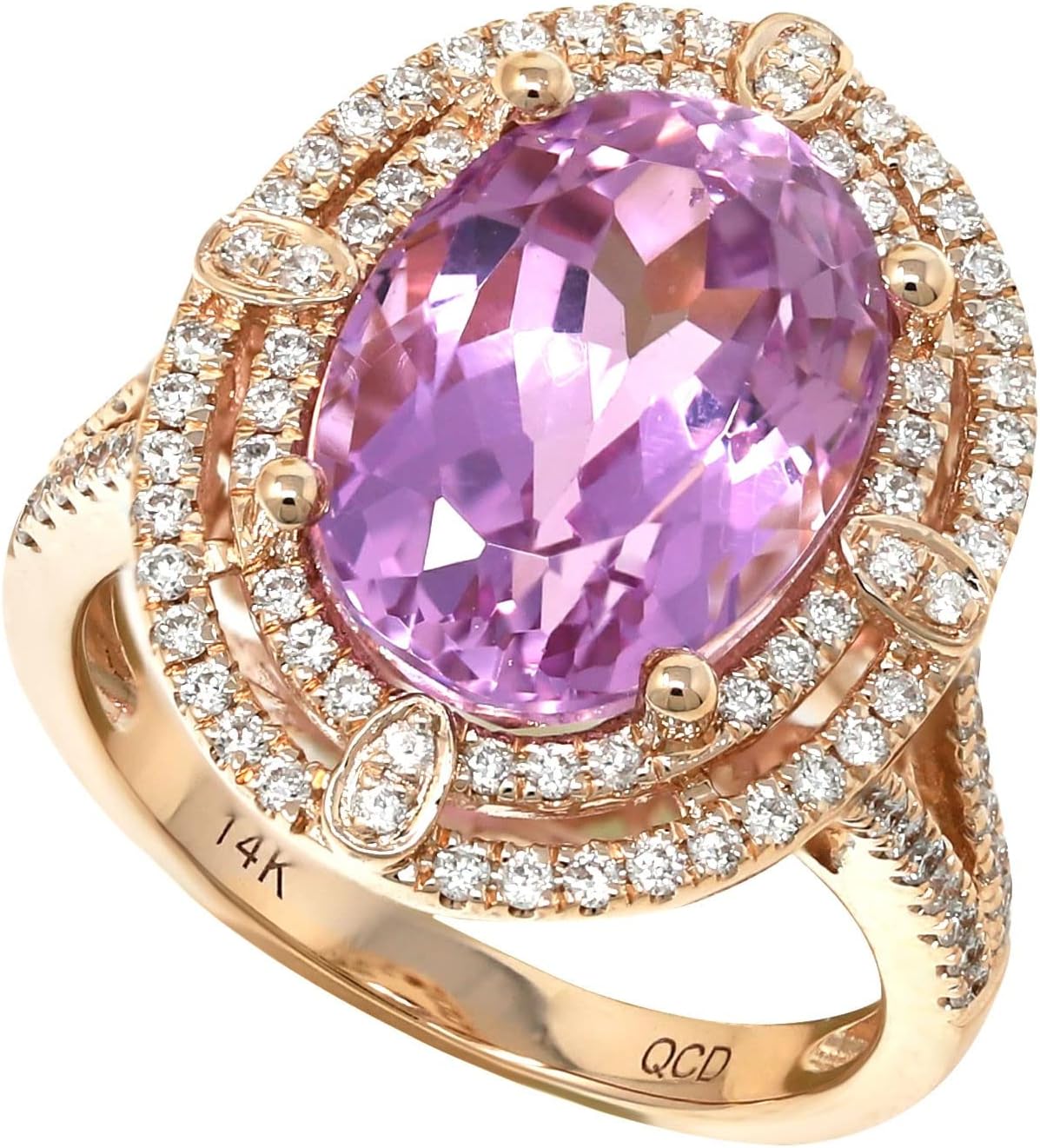 14K Rose Gold Genuine Kunzite 14x10 mm Oval, Diamond Double Halo Ring, Size 7
