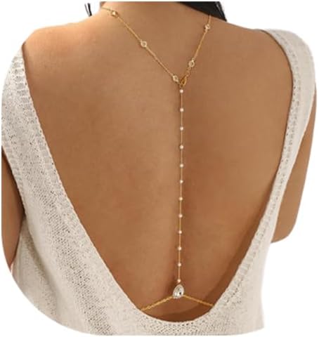 Rhinestone Back Chain Necklace,Crystal Drop BackDrop Jewelry,Wedding Bridal Long Pearl Back Necklace Jewelry for Women Backless Dress