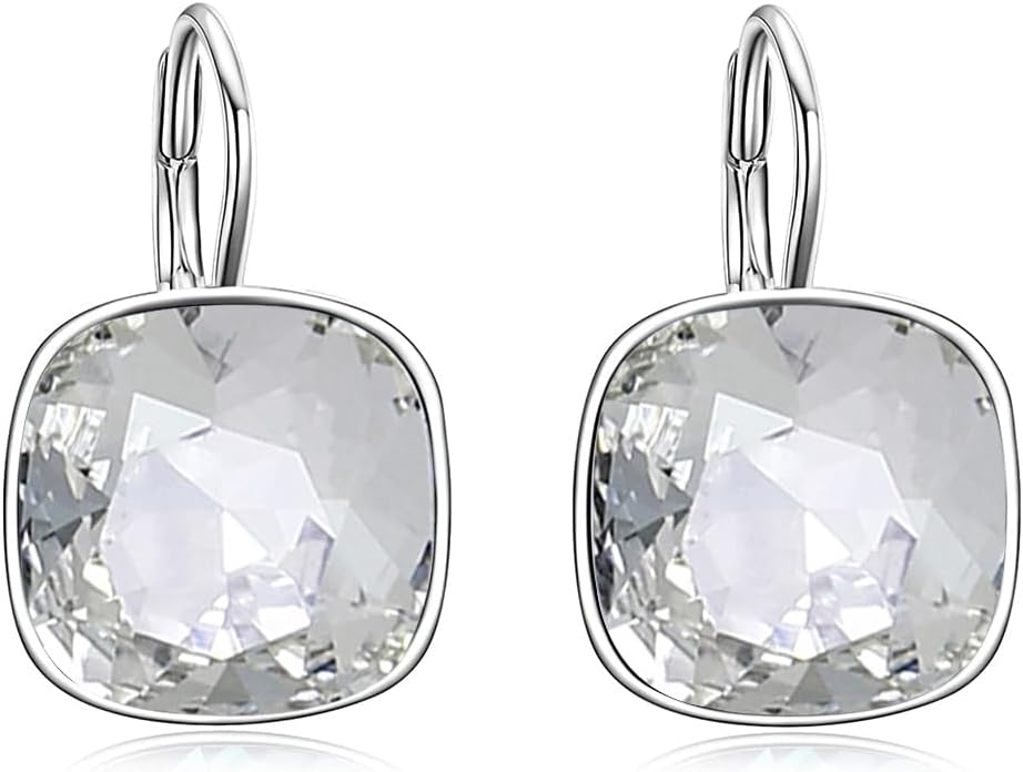 AOBOCO Sterling Silver Leverback Earrings Embellished with Crystals from Austria, Hypoallergenic Cushion Cut Square Crystal Earrings, Fine Anniversary Birthday Jewelry Gifts for Women