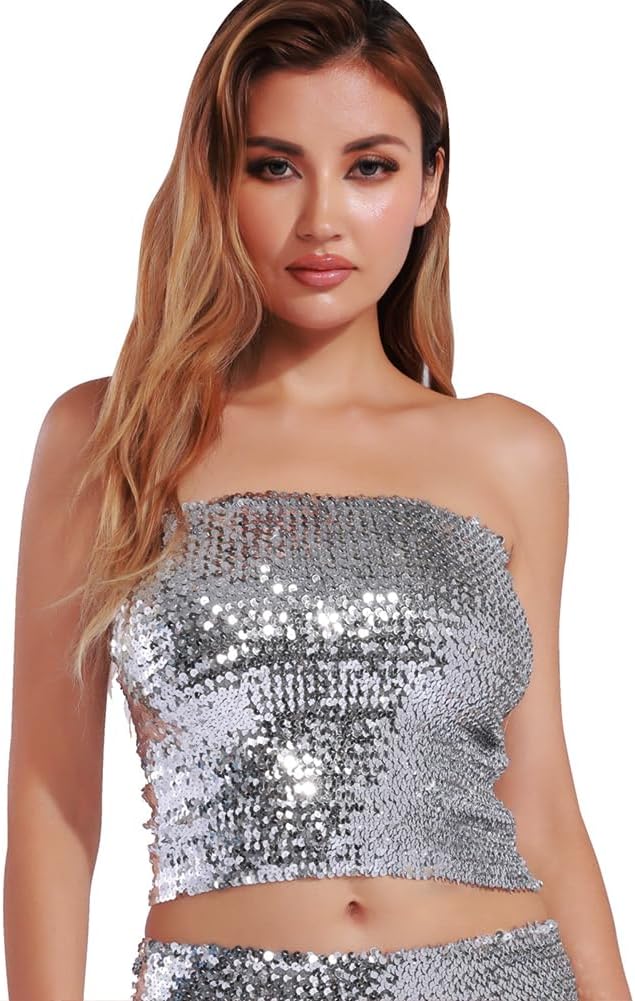 Women Belly Dance Sequin Tube Top Sparkle Sleeveless Crop Bra Club Vintage Rave Costume for Halloween Party