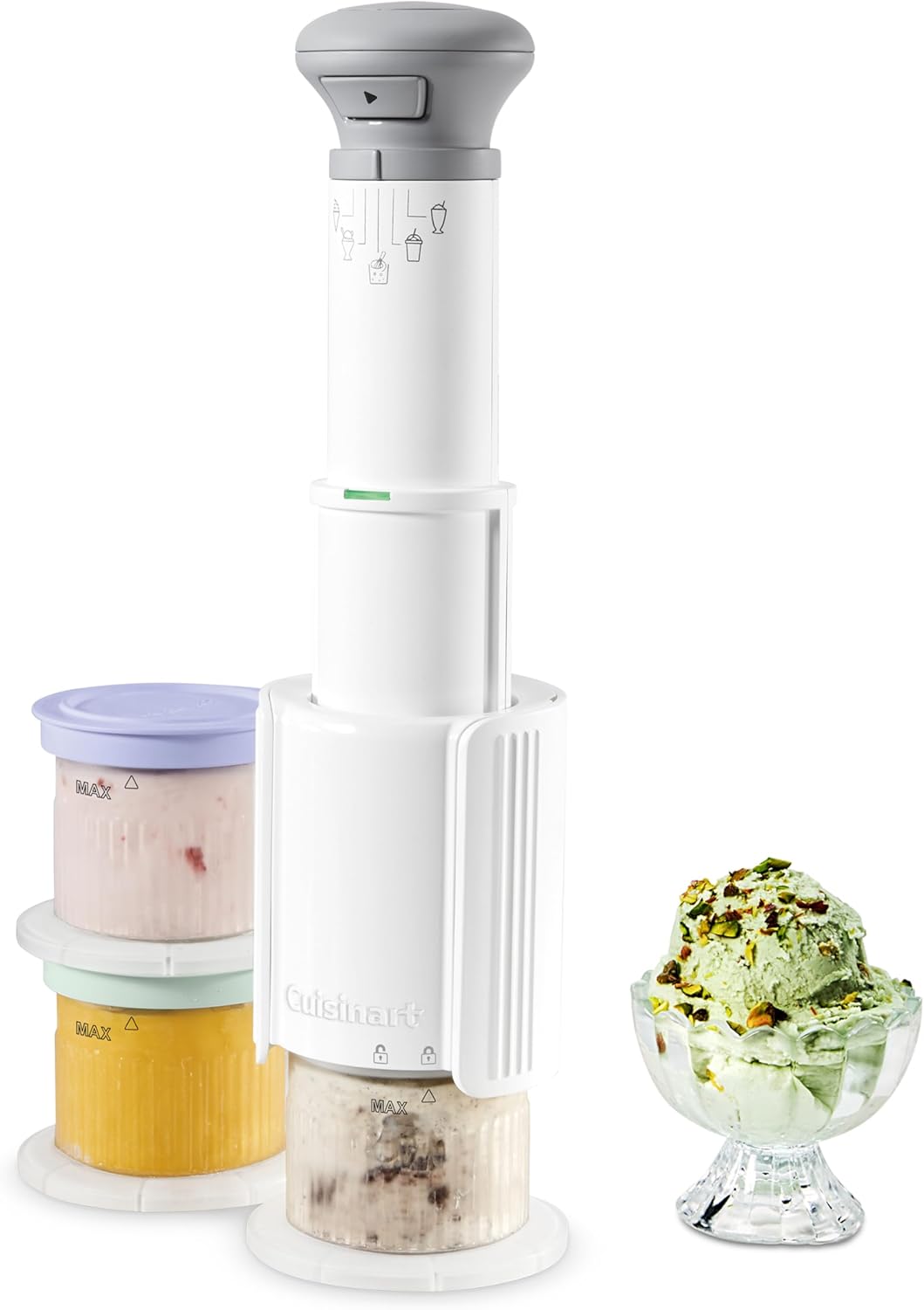 - 5-IN-1 FROZEN DESSERT MAKER: Cuisinart FastFreeze Ice Cream Maker delivers 5-in-1 functionality to make half a pint of frozen desserts in minutes (pre-freeze base 24 hours in advance) using your choice of pre-frozen ingredients.