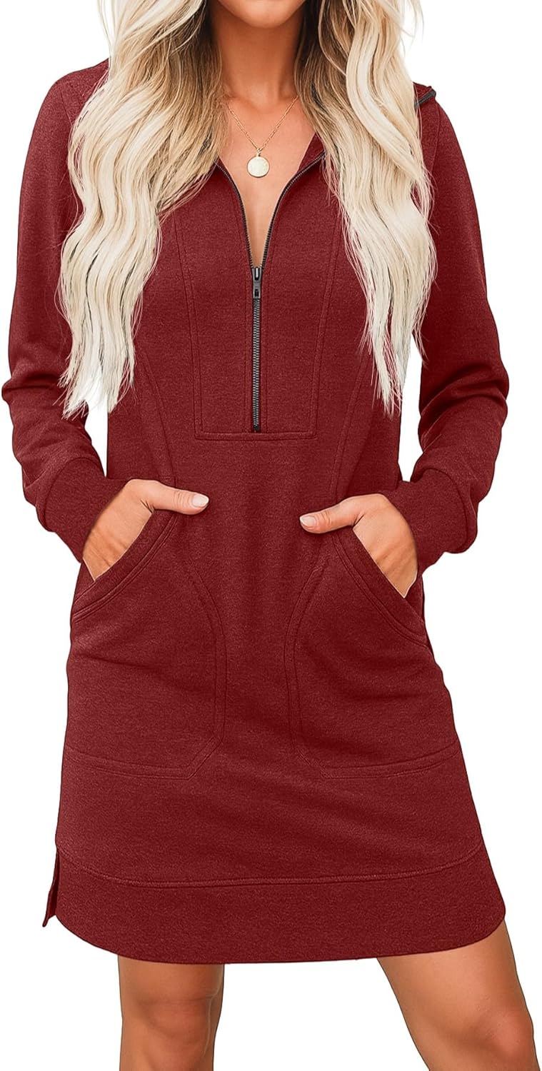 PrinStory Women’s Casual Dresses | Fall Winter Long Sleeve Half Zip V Neck Pullover Tunic Sweatshirt Dress with Pockets S-2XL