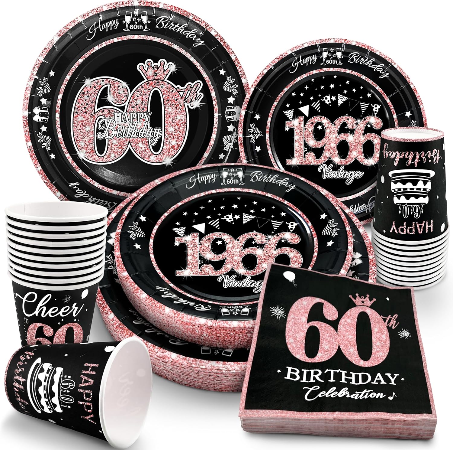 - All-In-One 60TH Birthday Party Plates Supplies: Package Includes: 30 x 9” Rose Gold 60th Birthday Paper Plates, 30 x 7” ‘1965’ Rose Gold Dessert Plates, 30 x 9oz Paper Cups, 30 x 6.5” Napkins. This 60th birthday party plates and napkins set has everything you need to throw a perfect family birthday party!