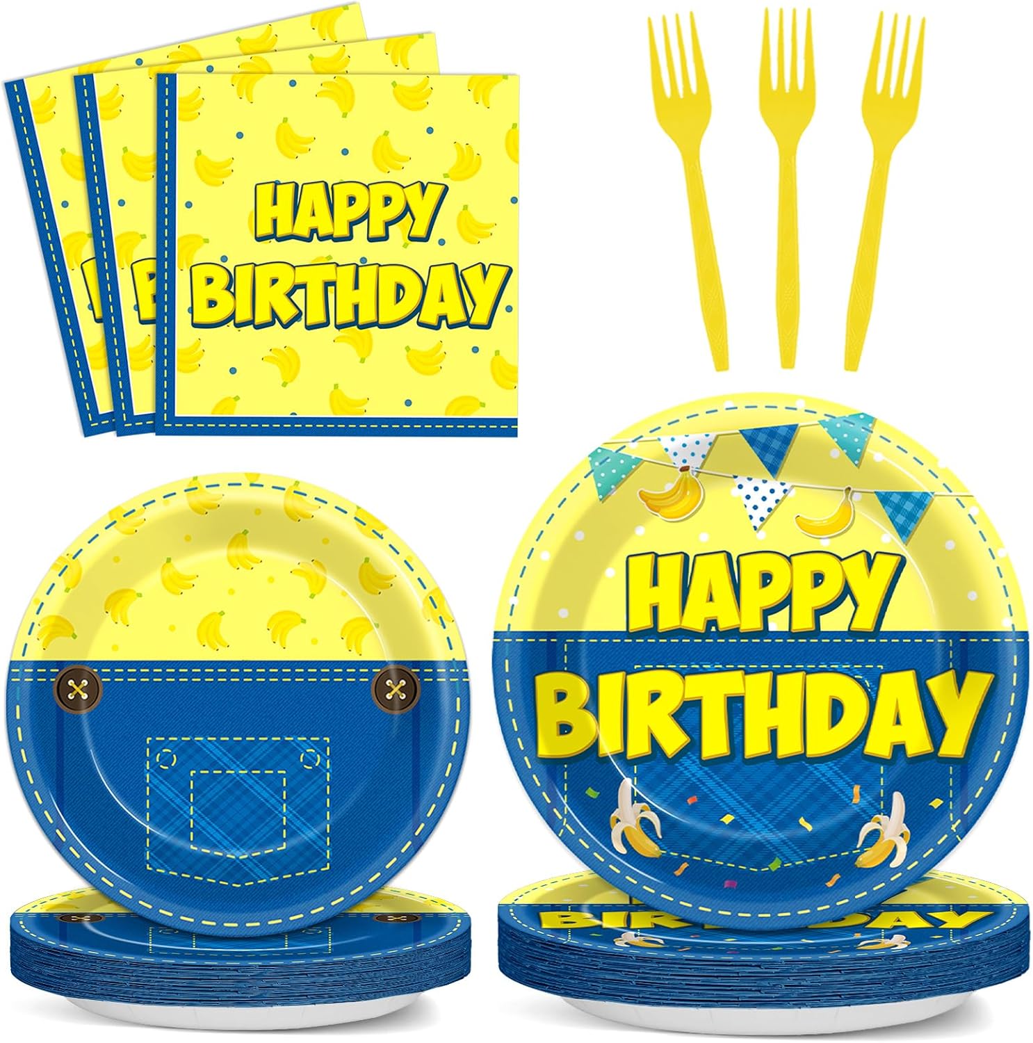 - Cheerful Cartoon Design: The yellow cartoon theme birthday party plates feature a fun, overalls-inspired pattern in blue denim, paired with a bright yellow background. Playful banana motifs and bold “HAPPY BIRTHDAY” text add extra charm to the design. The yellow forks complement the vibrant color scheme, creating a lively and coordinated look for any birthday celebration.
