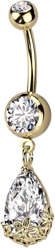 Pierced Owl 14GA Stainless Steel Floral Dangling Pear Shaped CZ Crystal Belly Button Ring