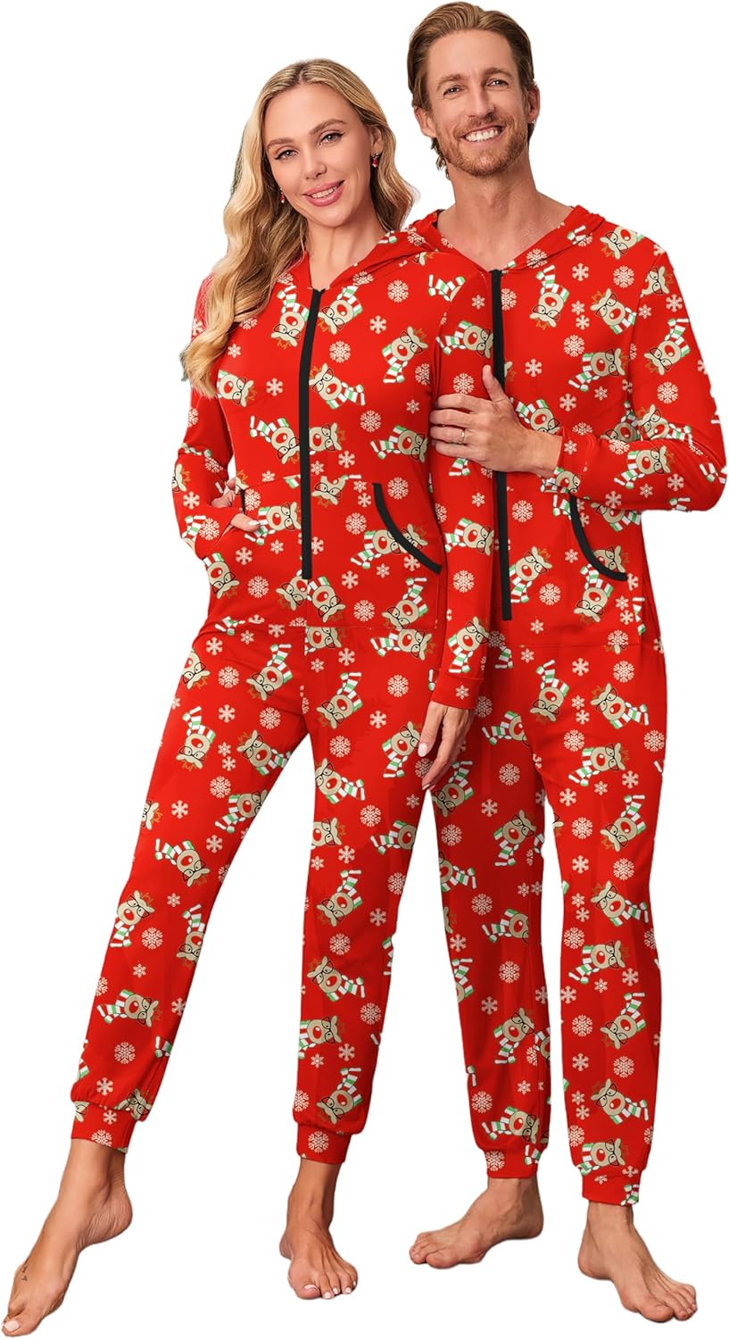 Ekouaer Christmas Matching Onesie for Couples Zipper One Piece Pajamas Adult Hooded Jumpsuit with Pockets