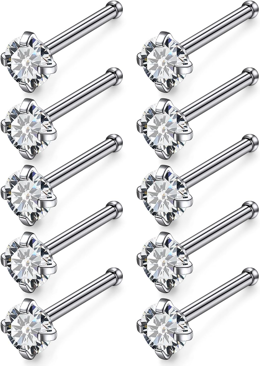 18G 20G 22G Titanium Stainless Surgical Steel Nose Rings Studs for Women L Shaped Nose Studs Screw Nose Ring Piercing Jewelry for Women Men Diamond CZ 1.5mm 2mm 2.5mm 3mm 10pcs