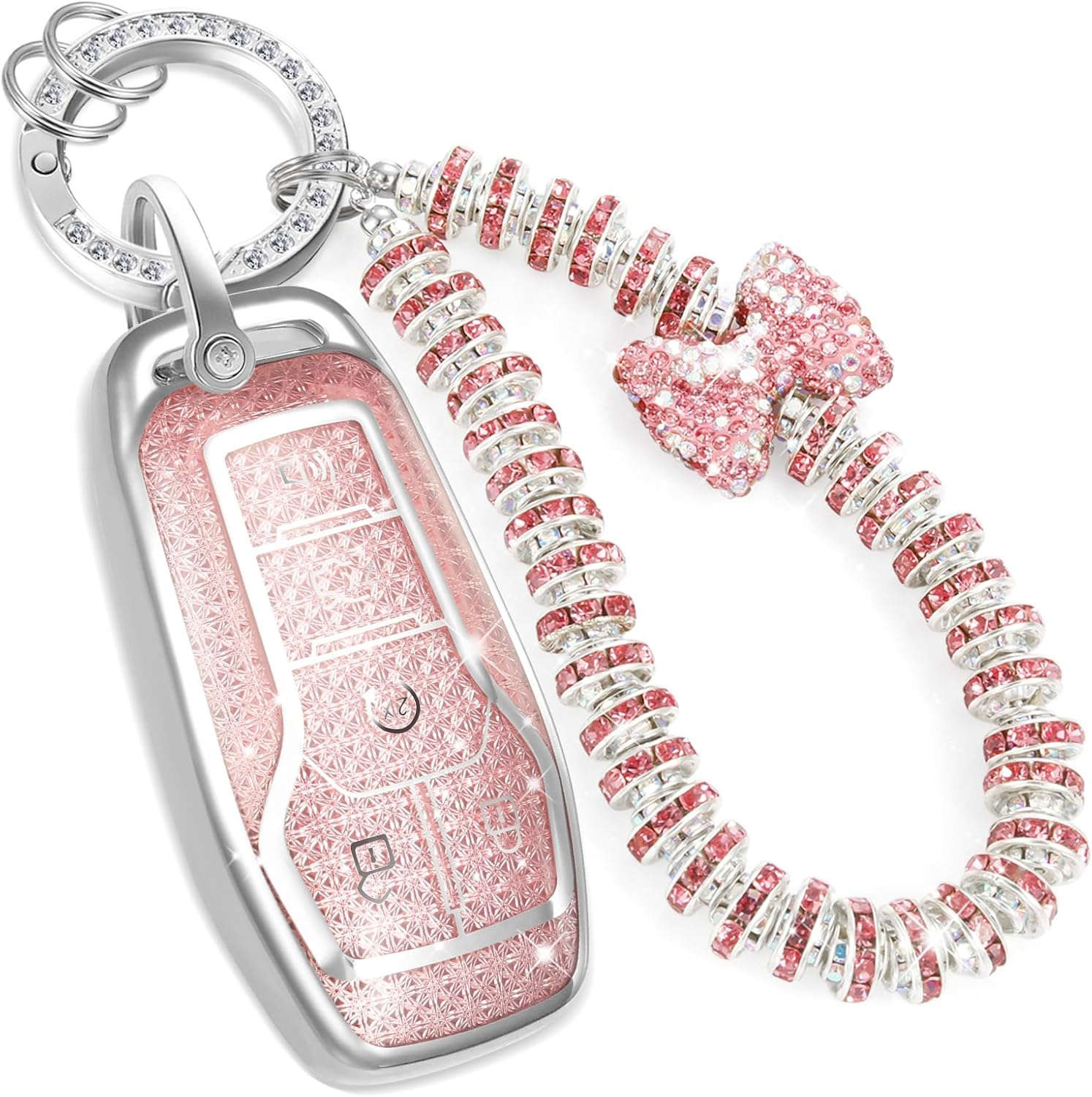 for Ford Key Fob Cover with Fashionable Zirconia Wristlet KeyChain, Enchanting Diamond Patterns Soft Case for Fusion Mustang F150-350 Edge Explorer Lincoln etc. (5 Button) Shell (Pink, A)