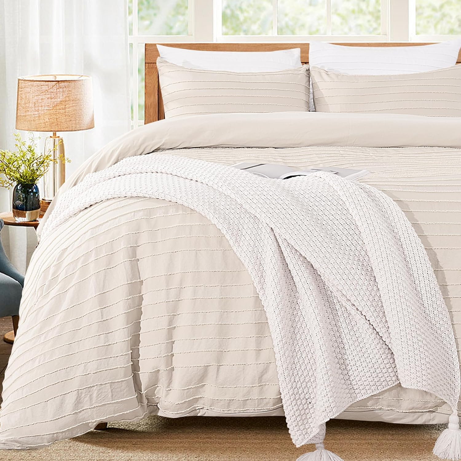 NEXHOME PRO Duvet Cover Queen,Beige 3 Pieces Boho Tufted Duvet Cover Set, Soft and Lightweight 100% Washed Microfiber Comforter Cover Set for All Season(Beige Queen, 90 x 90)-No Comforter
